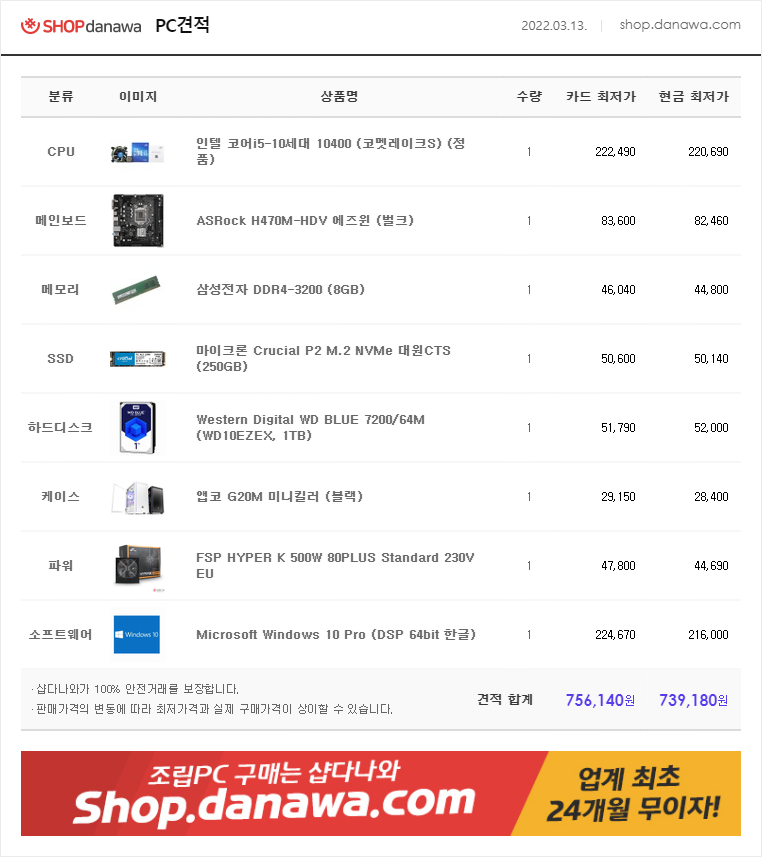 비슷한 사양으로 다나와에서 조립으로 견적해보았습니다.