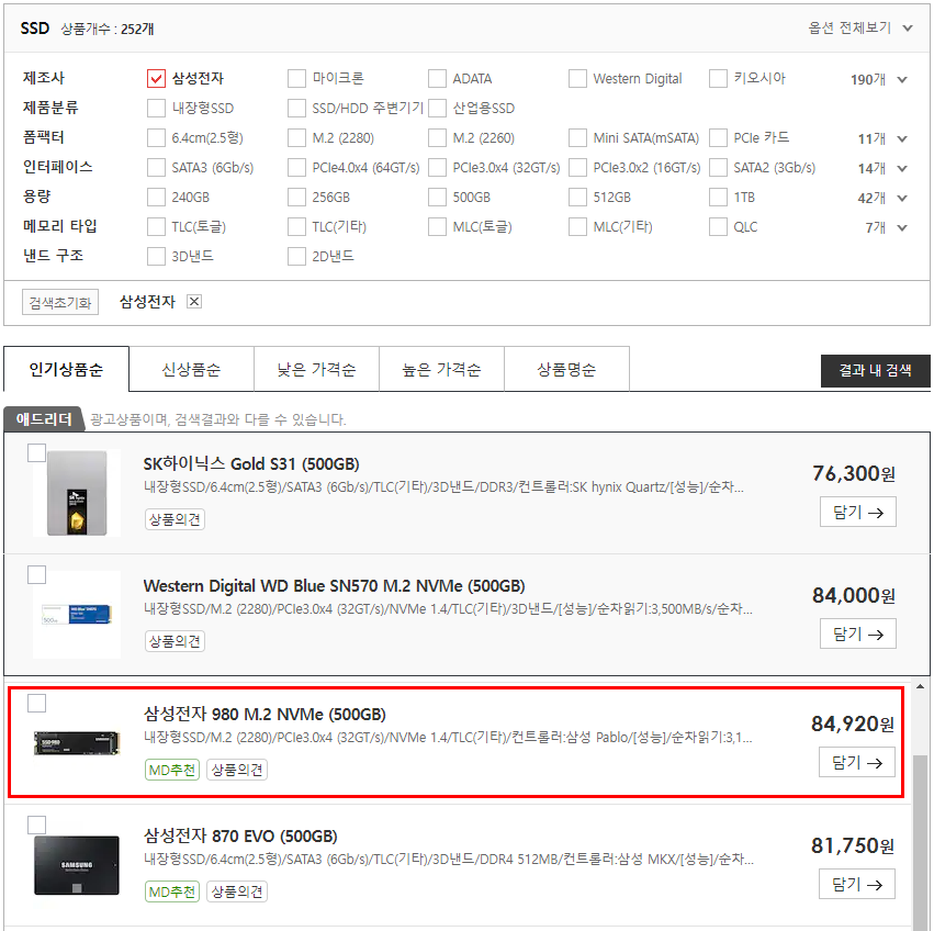 - M.2 SSD 하드는 삼성으로 선택했습니다. 바로 아래 SSD 보다는 속도가 5배 이상 빠르기 때문에 M.2 를 사용하시면 됩니다만 예산 문제가 있다면 SSD 를 선택하셔도 됩니다. 다만 병행수입이라고 적혀 있는 제품들이 있는데요. 이런 제품들은 가격이 좀 저렴하기는 하지만 AS 기간이 1년정도로 짧습니다. 정품이 5년 제한적 보증이니까요. 정품을 선택하셔야 합니다.