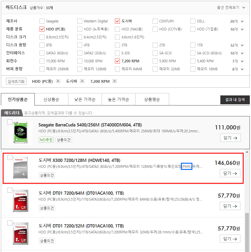 - ssd 는 용량이 클수록 가격이 상당히 비싸집니다. 그래서 데이터 저장용 HDD를 선택하시는게 좋은데요. 물론 예산이 넉넉하다면 SSD 1 ~ 2T 를 구입하셔도 됩니다. 추천하는 HDD는 도시바 4T 입니다. 7200rpm 제품이며 기록방식은 PMR 입니다.