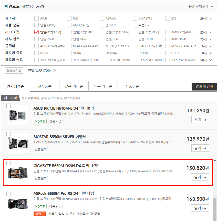 - 메인보드 항목에서 1700소켓을 클릭하면 해당 목록이 나옵니다. 예제에서는 GIGABYTE B660M DS3H D4 피씨디렉트를 선택하였습니다. 메인보드 선택할때 주의할점은 반드시 램 슬롯이 4개인 보드를 선택하시는게 좋습니다. 좀 저렴한 메인보드는 램슬롯이 2개만 지원되기 때문에 사용중 램슬롯이 고장이 나는 경우 램슬롯 교체가 안되면 보드를 바꾸어야 합니다.