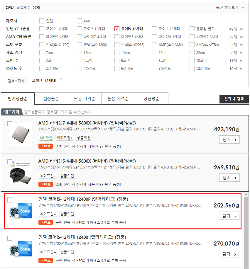 - 코어 i5-12 세대를 선택해보았습니다. 그러면 해당되는 cpu 목록이 종류별로 나열되는것을 확인할 수 있습니다. 예제에서는 인텔 코어i5-12세대 12400F 를 선택해보겠습니다. cpu 설명에 보시면 소켓 1700으로 나와있습니다. 메인보드를 선택할때 인텔 소켓 1700을 지원하는 보드를 찾으면 됩니다.