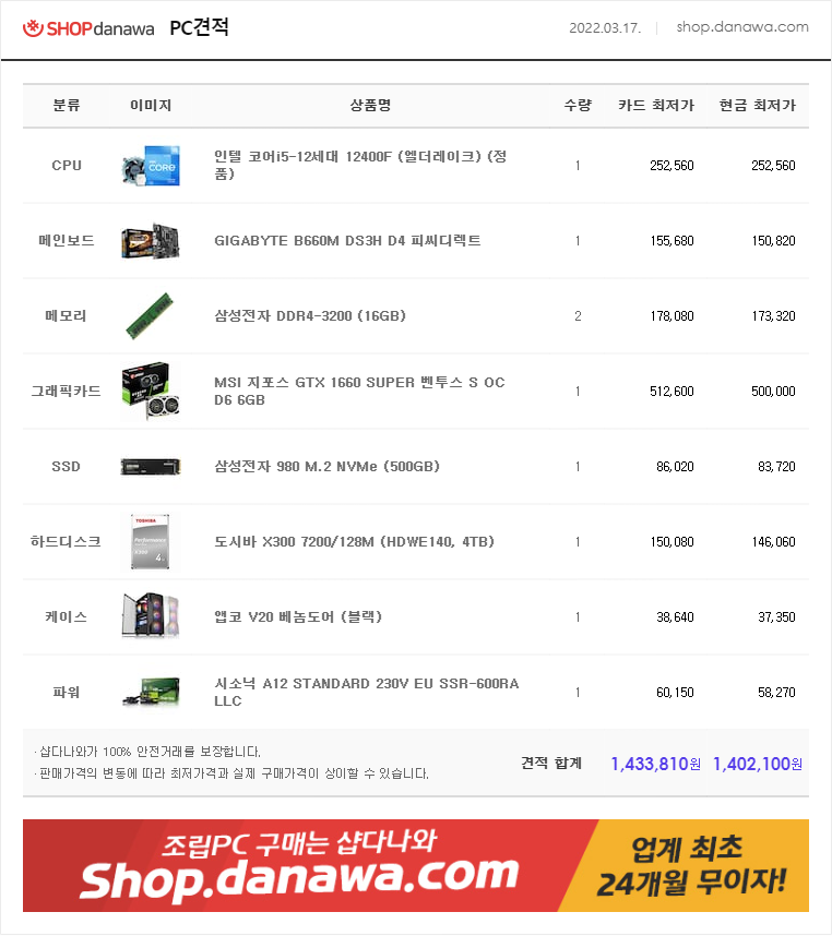 - 이렇게 되는군요. 이정도 스팩이면 배그 기준으로 중상옵정도는 무난히 돌릴 수 있습니다. 다나와 커스텀 하기는 매우 쉽습니다. 부품의 조합방식만 안다면 누구나 견적이 가능하며, 이 견적으로 다나와에 등록된 업체에 가격문의를 하시면 됩니다. 다행히도 조립대행과 출장AS 1년 기본 제공이 되기 때문에 초보자들에게는 아주 적합한 서비스입니다. 다만 출장 AS의 경우 옵션에서 선택하셔야 하며 가격이 추가 됩니다.