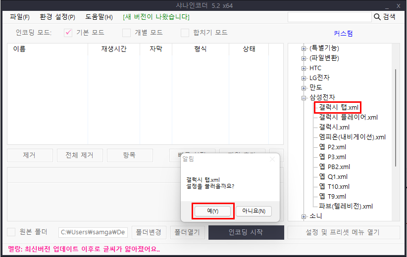 샤나 인코더의 또하나의 장점은 커스텀 기능입니다. 각각의 제조사 기기에 맞는 설정이 저장되어 있기 때문에 필요한 기기의 항목을 클릭하시면 설정을 불러옵니다. 별도로 세팅할 필요가 없는 것이죠. 예제에서는 갤럭시 탭을 설정해보았습니다.