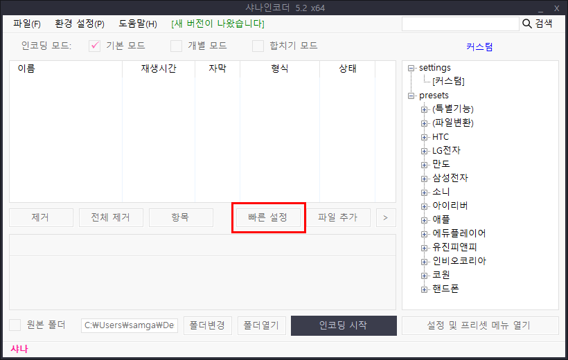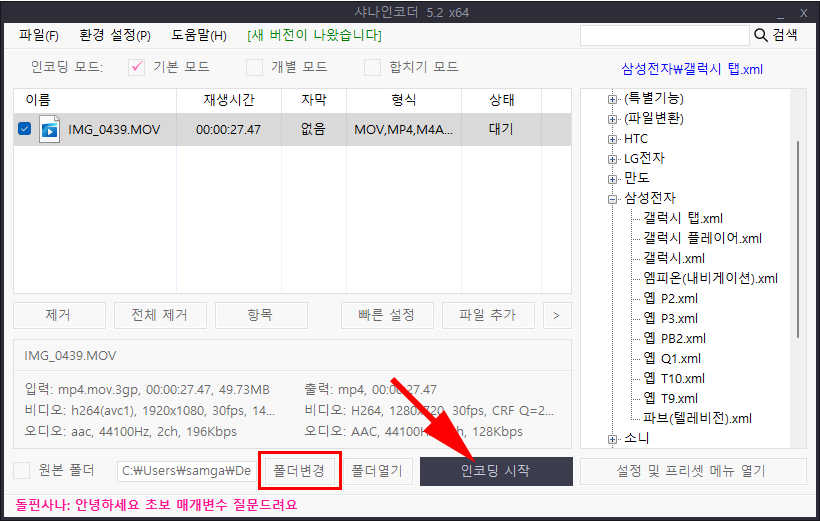 다운로드 폴더를 변경하실려면 폴더변경 버튼을 클릭하시고 설정하시면 됩니다. 보통 업로드 파일이 있는 곳에 설정하는것이 찾으러 다니지 않아도 되니까요. 설정을 완료하셨다면 인코딩 시작 버튼을 클릭하세요.