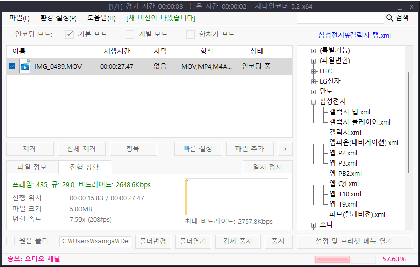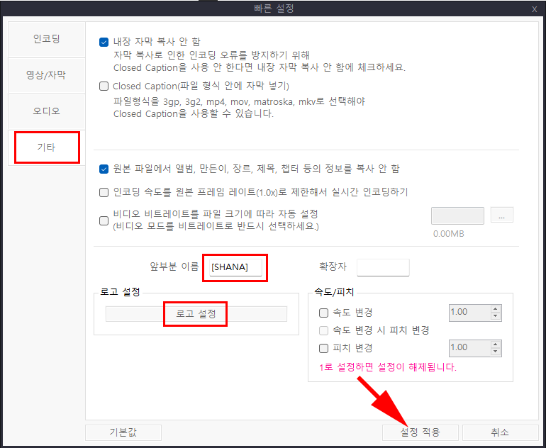 인코딩중입니다. 파일 크기가 작기 때문에 불과 몇초만에 완료되었습니다. 작업완료된 파일을 원본파일과 겹치지 않게 파일명이 달라야 하는데요 기본값으로 [SHANA] 가 설정되어있습니다. 팁을 드리자면 파일 앞부분 이름을 변경하거나 로고도 넣을 수 있는데요.