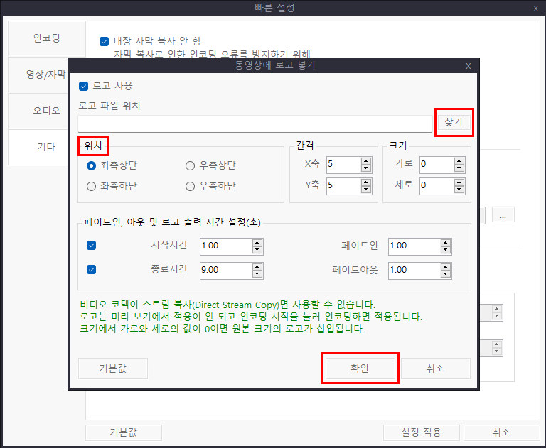 로고 파일 위치의 찾기 버튼을 클릭하시고 만든 로고를 불러옵니다. 로고는 바탕화면이 투명한 png 파일로 만드셔야 합니다. 그리고 위치를 정하시고 확인버튼을 클릭하시면 됩니다. 샤냐 인코더는 동영상 인코딩으로 쉽고 간단하며 용량도 매우 작습니다. 최적화가 잘되어 있고 필수 기능은 모두 제공하므로 간단한 영상 인코딩 작업을 할때 요긴합니다.